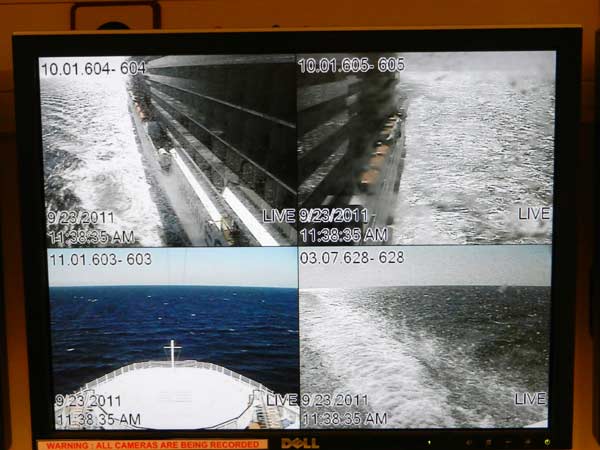 In the engine room, as on the bridge, computer screens show views of all four directions from the ship at once. The captain can see everywhere at all times. The main propellers can pivot 360 degrees, and there are three tunnels bored across the hull in the bow with a propeller in each — giving the pilot an ability to thrust the bow right or left. And, when necessary, the ship can be "at anchor" without dropping the hook but by locking in its GPS coordinates. When activated, this system can keep the ship stationary — moving less than 10 meters in any direction.