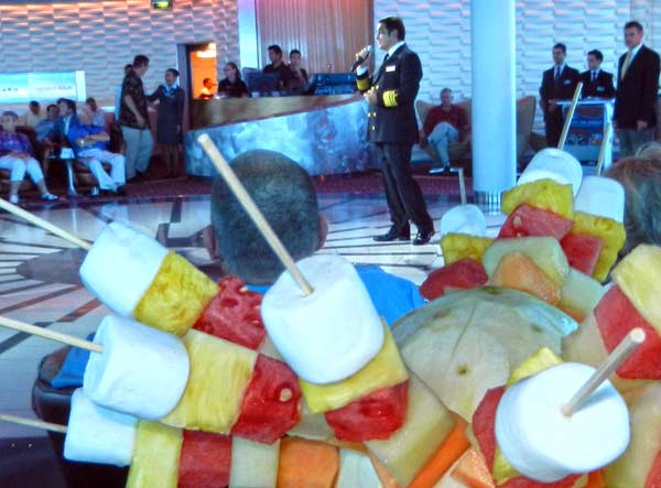 Cruise lines know which passengers are the frequent cruisers, the big shoppers, and the big gamblers. These get a special status that includes "face time with the stripes." There's something about the culture and clientele on a cruise ship that gets a thrill out of socializing with the officers. While there are literally half as many crew members as there are passengers, the officers — people with stripes on their jackets — are a special elite. And it seems a big part of their work is to hobnob with the VIP passengers. Here, the captain is hosting a special wine and dance get-together in a room that was far more elegant than the snacks. Does it seem I'm pro-cruising? Selling out? What do you think?