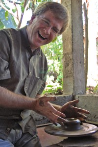 The potter’s son helps me get the wheel turning with a full head of steam, and then slams a blob of clay onto my spinning work table. I cup it, and it wobbles. He shows me how to be gentle with the clay. As he trickles on some water and guides my fingers and thumbs, the clay comes to life. But my creation is still a clumsy little baby…eventually made elegant, effortlessly, by my teenage teacher.