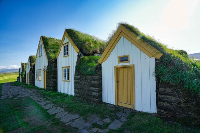 Skagafjörður — a fertile valley leading up to a yawning fjord — has several good countryside, farmhouse B&Bs for an overnight, as well as the charming small town of Hofsós (with its Emigration Center — telling the story of Icelanders who fled to Manitoba and the Dakotas in the hardscrabble late 19th century — and a small but inviting thermal swimming pool overlooking the fjord). But the main sightseeing draw in this swath of Iceland is the excellent Glaumbær open-air folk museum, where you can explore the sod-lined halls, storerooms, and sleeping quarters of a traditional Icelandic turf house.