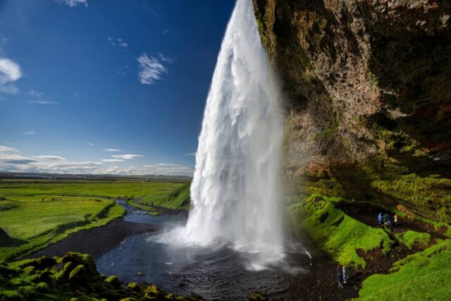 About two hours farther west, at the town of Vík, you approach the craggy, bald, grass-covered mountains of the South Coast — the last leg of the Ring Road, and a popular day trip in its own right from Reykjavík. Along here you can stroll along the black-sand beach at Reynisfjara, hike up to see a glacier at Sólheimajökull, tour the open-air folk museum and see a fine waterfall at Skógar, get a good look at Eyjafjallajökull (the volcano that famously erupted in 2010, halting European air travel), and ogle the stunning Seljalandsfoss waterfall — where (wrapped in a good rain jacket and waterproof shoes) you can actually hike around behind the thundering spray.