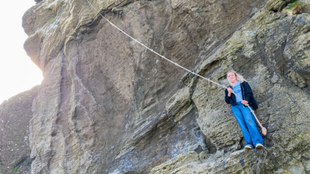 We wanted to show how islanders climb and swing on long, dangling ropes to reach bird nests perched in the crags of sheer cliffs. Ebbi normally demonstrates this for his tours, but we asked if he knew any local kids who might enjoy showing off their skills. Íris contacted a teenager named Aðalbjörg, who met us at the cliffs. Ebbi explained how islanders traditionally used these ropes to harvest sea bird eggs — a rare source of nutrition on this very sparse island — while, in the background, we watched Aðalbjörg swinging back and forth like Tarzan. It’s worth stressing that she was not “performing” for our cameras; young islanders are raised to swing on these ropes…even if, these days, it’s more for cultural heritage than for the eggs. In fact, while we were filming, a few young boys rode up on their bikes and — entirely unprompted by us — began swinging around on a smaller nearby cliff, just for fun.
