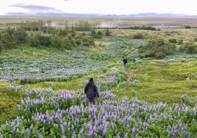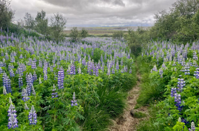 And as we walked, something beautiful happened: We realized we were traipsing through a stunning corner of unspoiled Icelandic nature. We were following a very old, virtually unmarked footpath — one that, clearly, exceedingly few hikers used. It curved between gloriously colorful fields of purple lupine flowers, over rocky but passable terrain, under a big sky.