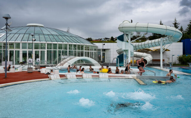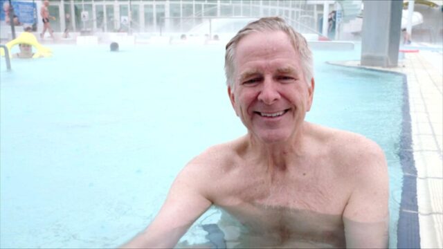 Meanwhile, we’d also made plans to film Rick at a very local-feeling pool in suburban Reykjavík, called Árbæjarlaug — my favorite of the half-dozen or so pools I’ve tried in the area. (TV scouting is hard work…but someone has to do it.)