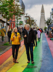Then Saga and Rick strolled together through the back streets of Reykjavík. Hitting each point on our “wish list” for this interaction, Saga taught Rick a little Icelandic; showed off some street art, a Reykjavík specialty; explained the brightly painted, corrugated “iron” cladding that Icelanders wrap their homes in; and pointed out the many propped-open windows, which Icelanders use to keep the air moving when things get stuffy (thanks to the abundant natural geothermal energy they use for heating). It wound up being one of the best — and longest — segments in the show.