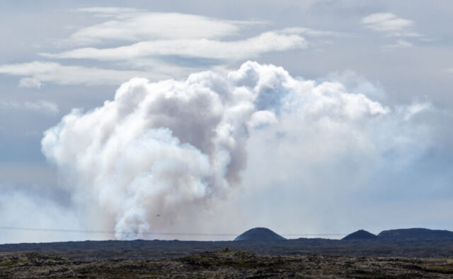 As we entered the home stretch back to Reykjavík, finishing up our 800-mile journey, we kept our eyes peeled on the horizon. And sure enough, as the skyline of the capital came into view, beyond it we noticed a strange-shaped “cloud” that wasn’t a cloud at all…but a smoke plume from that volcano.