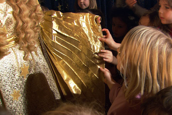 In southern Germany, an angel named the Christkind brings the goodies. She tells the wonder-struck children "if you're very, very gentle…you can touch my wings."